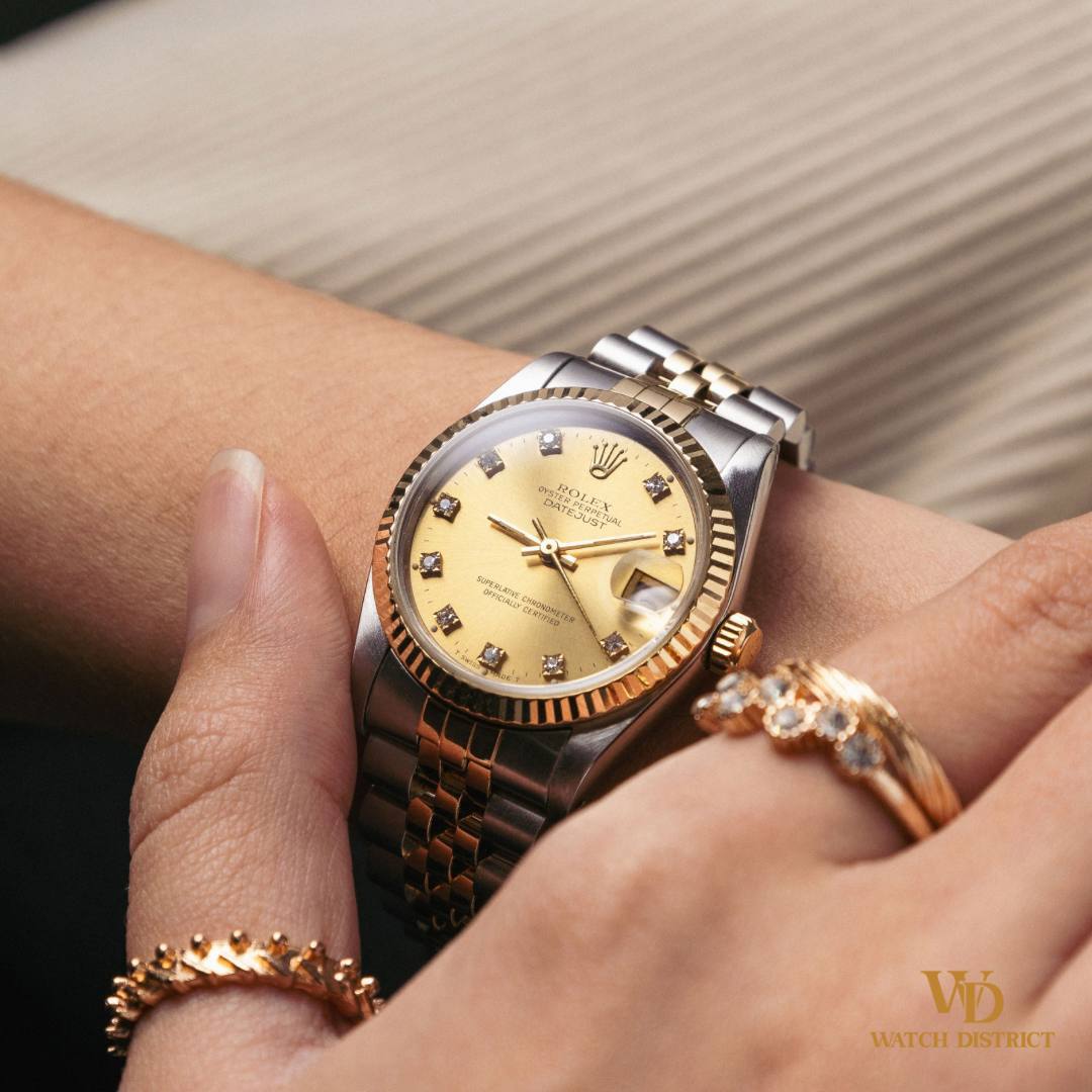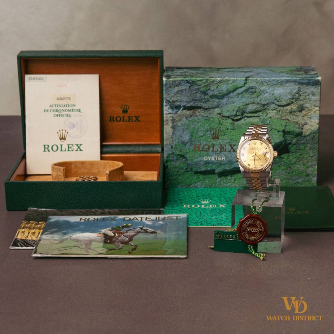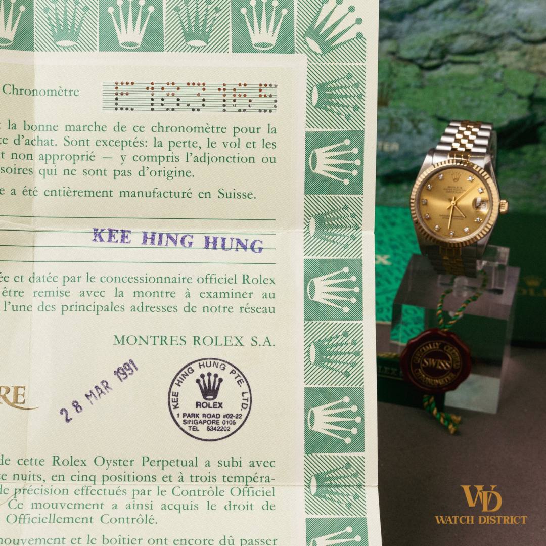 This 31mm two-tone gold timepiece is accompanied by its original Rolex box and local warranty certificate dated 28 March 1991, ensuring provenance and collector’s value!