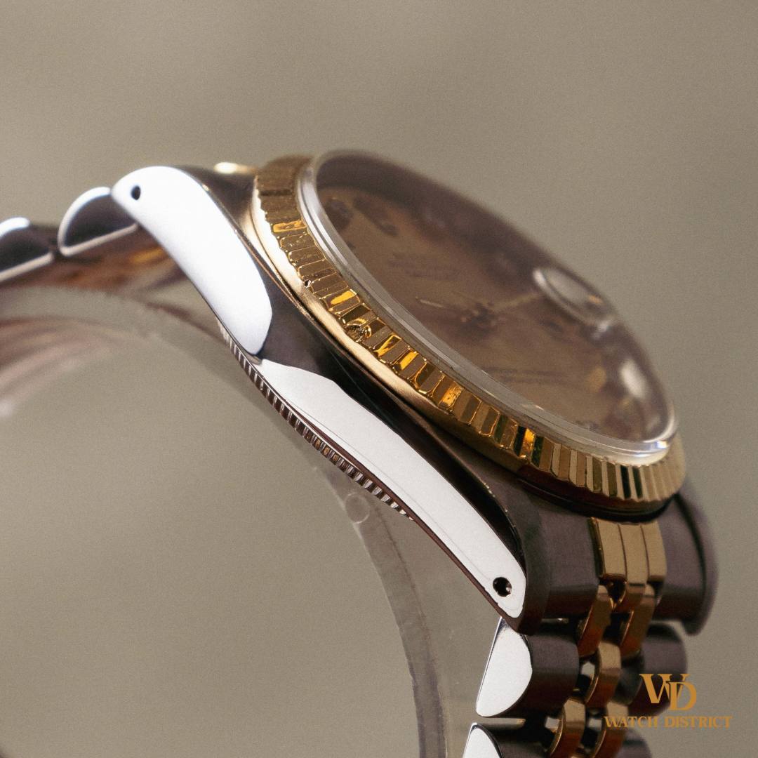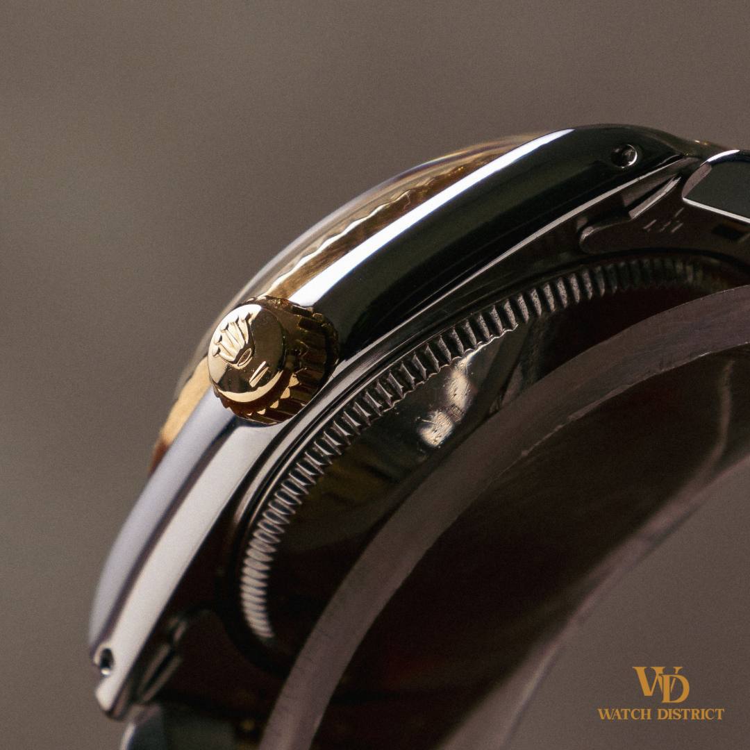 The meticulously crafted 18k yellow gold bezel complements the lustrous dial, while the 10-Pt Rolex cut diamonds provide a classic and luxurious touch.