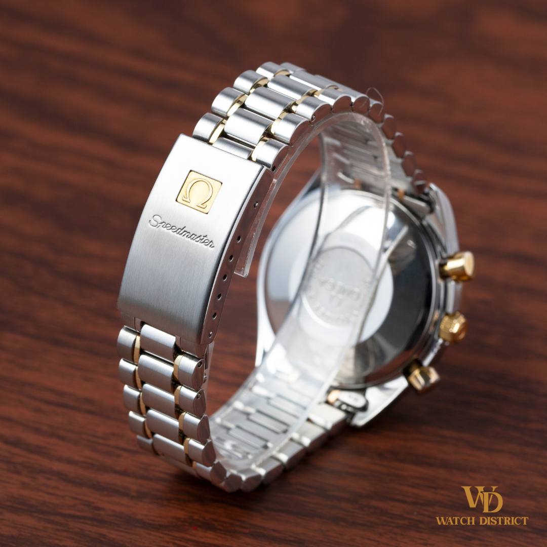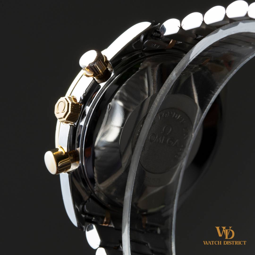 Housed in a 39mm stainless steel case with gold-plated pushers and crown, this Speedmaster offers a comfortable size perfect for everyday wear. The automatic Omega Caliber 1151 inside is based on the reliable Valjoux 7751, giving the watch not just chronograph functionality, but also a complete calendar with day, date, and month displays—adding both complexity and character to the dial layout. The gold-accented bracelet continues the two-tone design language, offering a perfect balance between sportiness and dressy appeal.