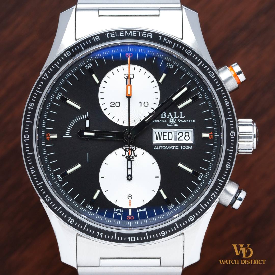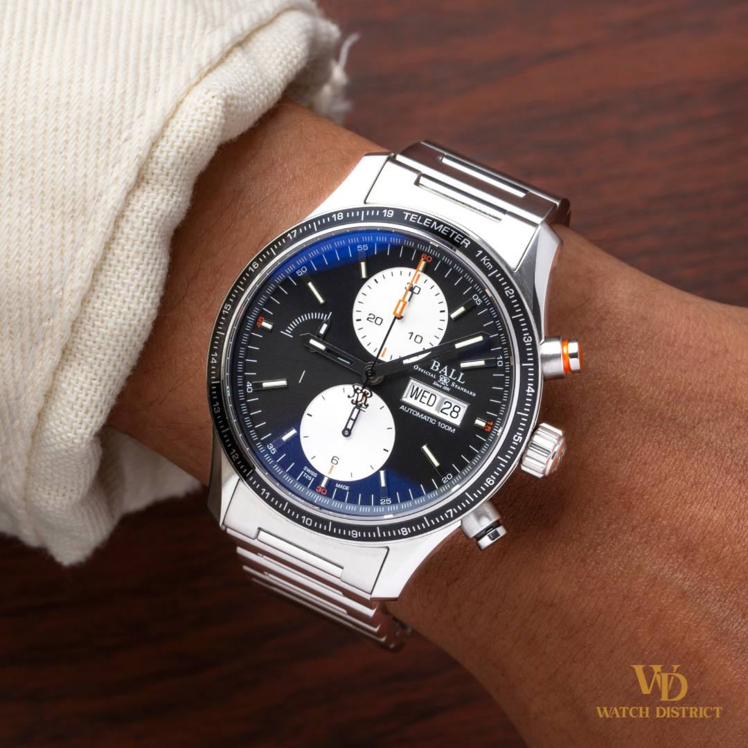 A striking blend of precision engineering and classic chronograph styling, this Ball Engineer Master II CM3090C commands attention with its crisp panda dial layout and sporty telemeter bezel. Housed in a robust 43mm stainless steel case and powered by an automatic movement, it features a day-date complication, dual-register chronograph, and Ball’s signature micro gas tube lume for unmatched low-light visibility.