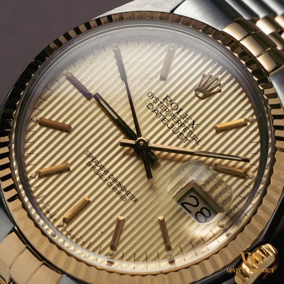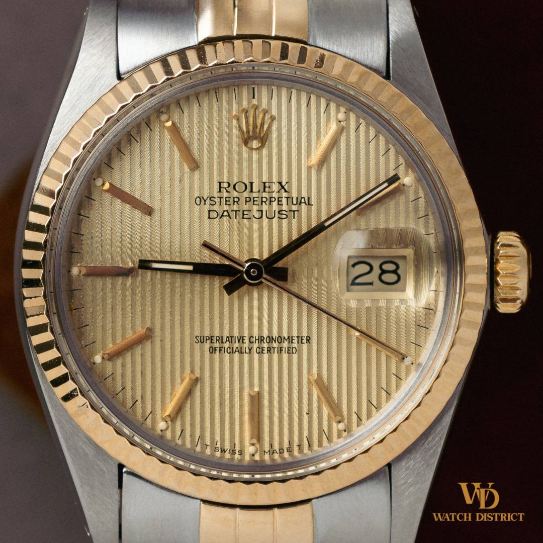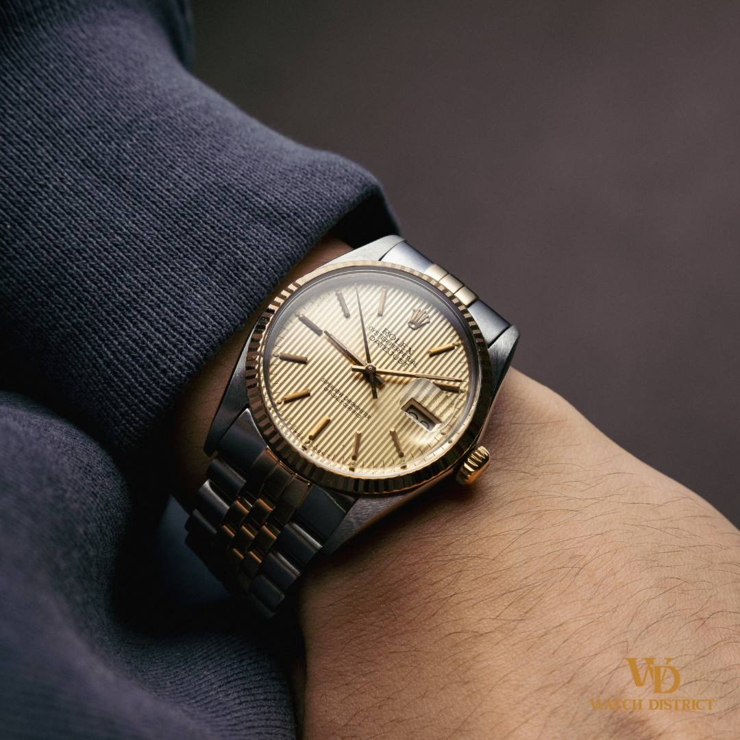 We are thrilled to offer this exquisite two-tone 36mm Rolex Datejust Ref. 16013, featuring a striking & famed Tapestry dial that elevates its elegance.The combination of gold and stainless steel on the 1980s Datejust gives it a versatile appeal, seamlessly transitioning from formal to casual occasions.