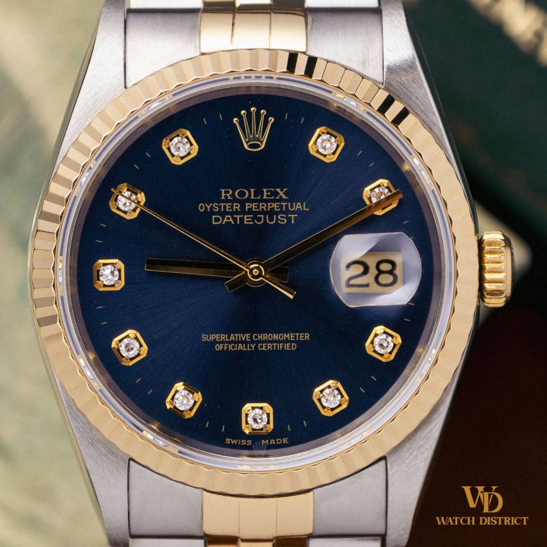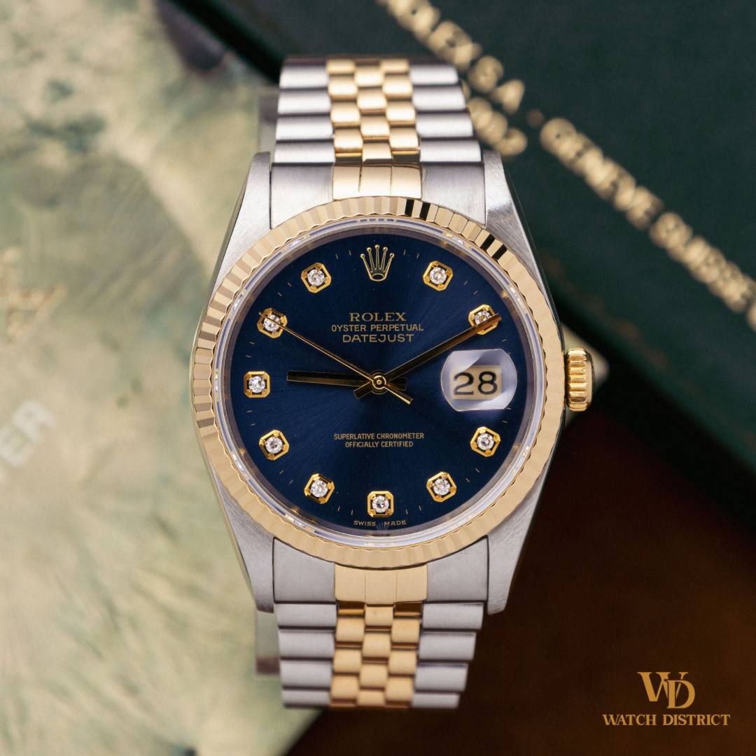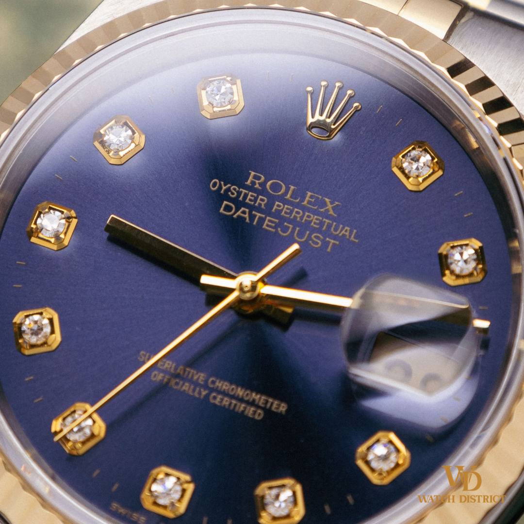 The striking navy blue dial is enhanced by ten dazzling diamond hour markers, providing a sophisticated contrast against the gold-tone hands and markers. The 36mm Datejust captures the essence of Rolex craftsmanship and timeless design.