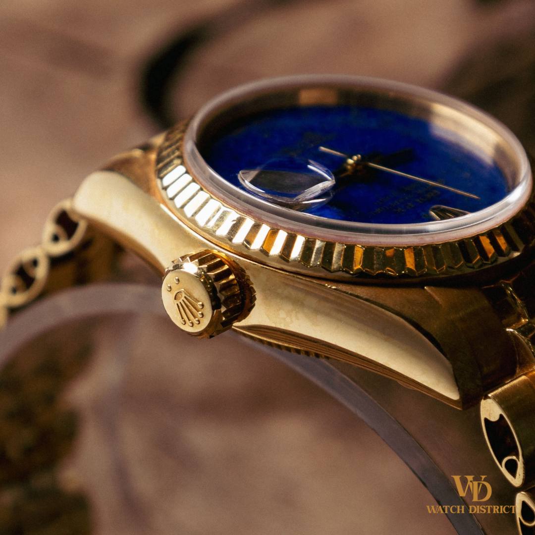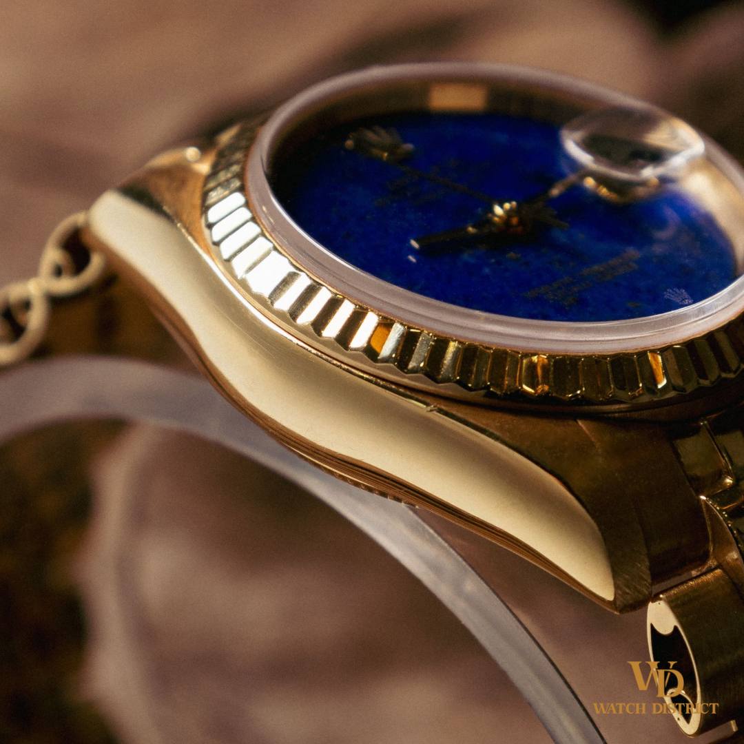 The deep, rich blue of the Lapis Lazuli contrasts beautifully with the 18K solid yellow gold case. The classic fluted bezel and the absence of dial markers highlight the watch’s refined elegance, making it suitable for virtually any occasion.