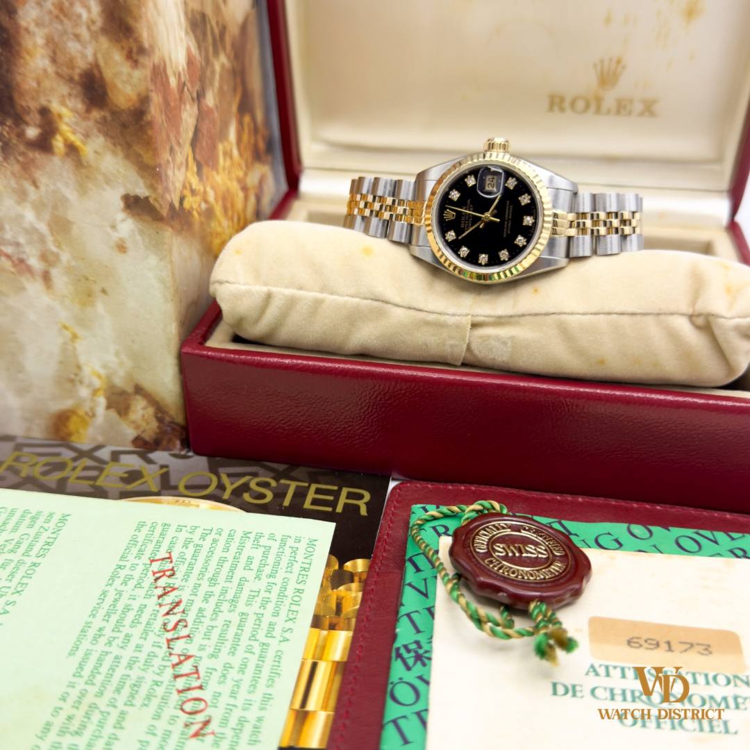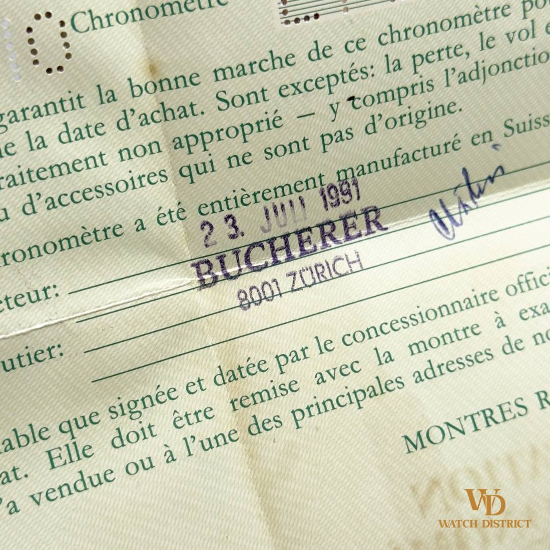 This complete Bucherer Zurich full set, dated July 23, 1991, features a rare and highly desirable 10-point big diamond factory black dial. Additionally, it has undergone a full in-house service, completed in June 2024.