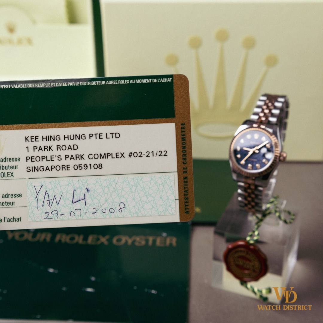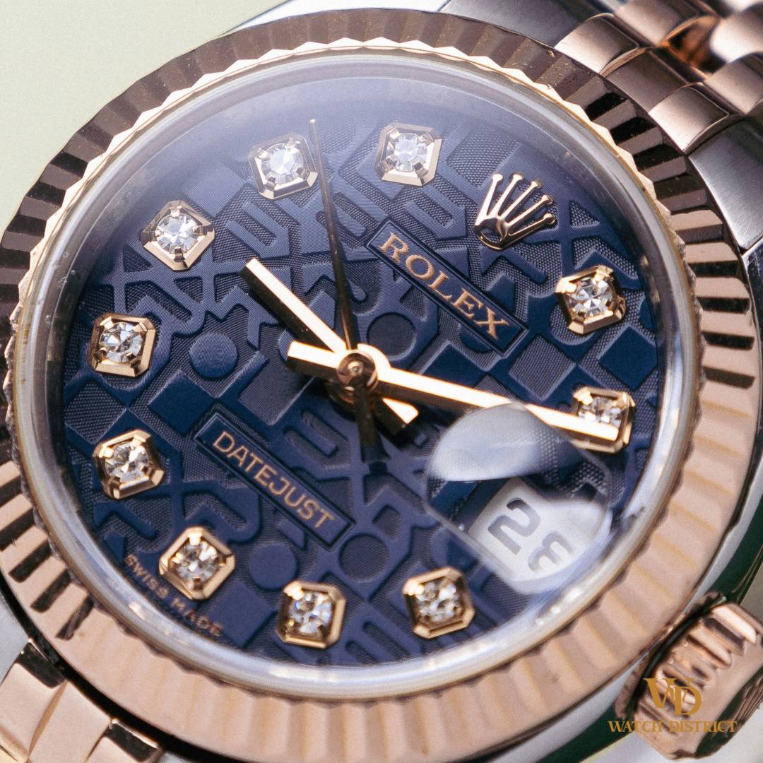 The case of the 179171 measures 26mm and is crafted from 18k Everose gold, Rolex's proprietary rose gold alloy. This material not only provides a warm, elegant glow but is also highly durable and resistant to fading. The combination of this exquisite metal with the unique & rare navy diamond Jubilee anniversary dial creates a stunning visual impact, making the watch both a statement piece and a classic accessory.
