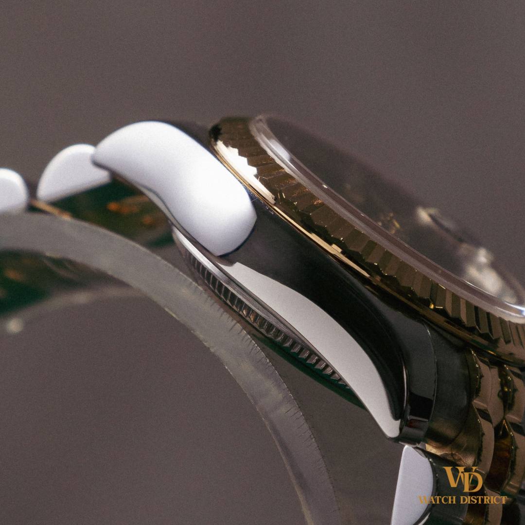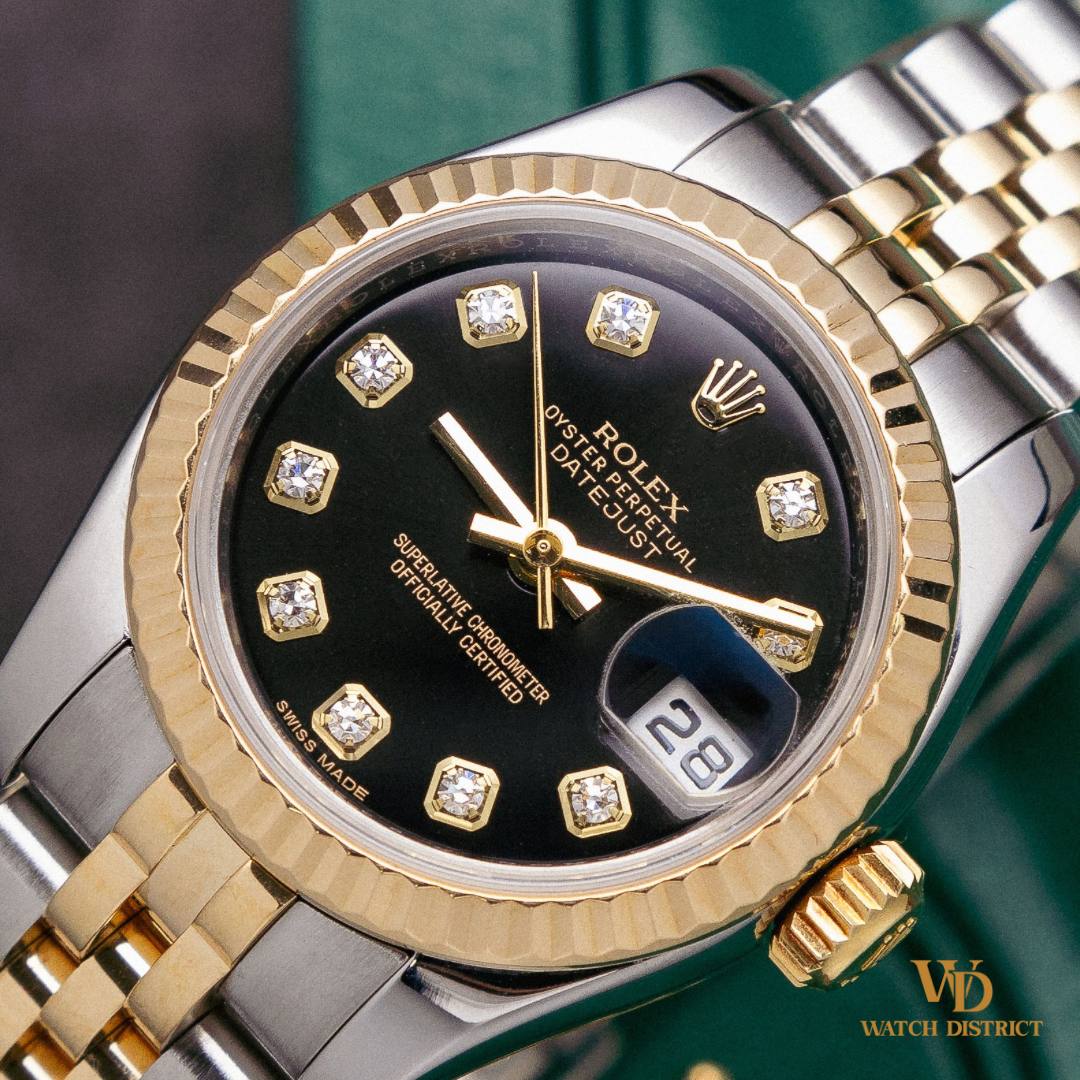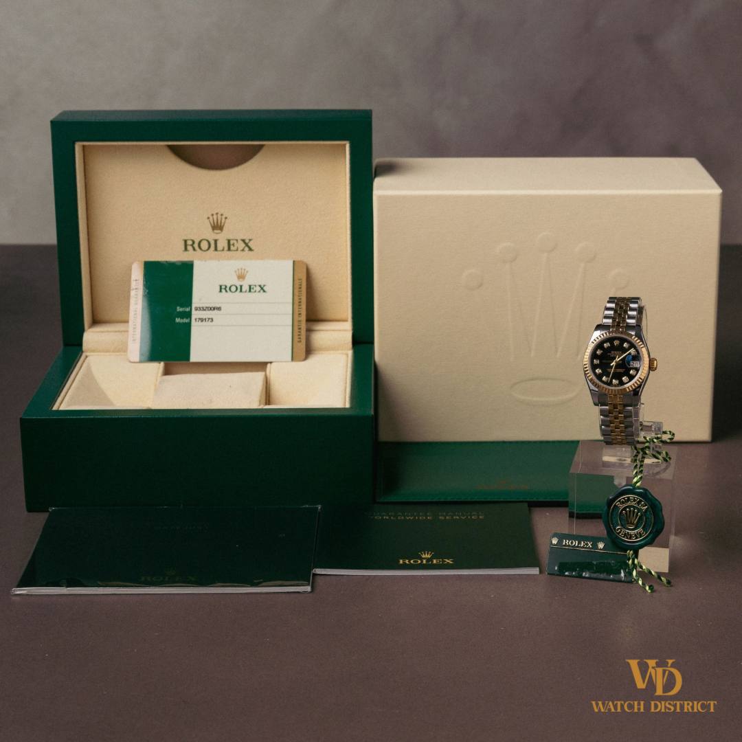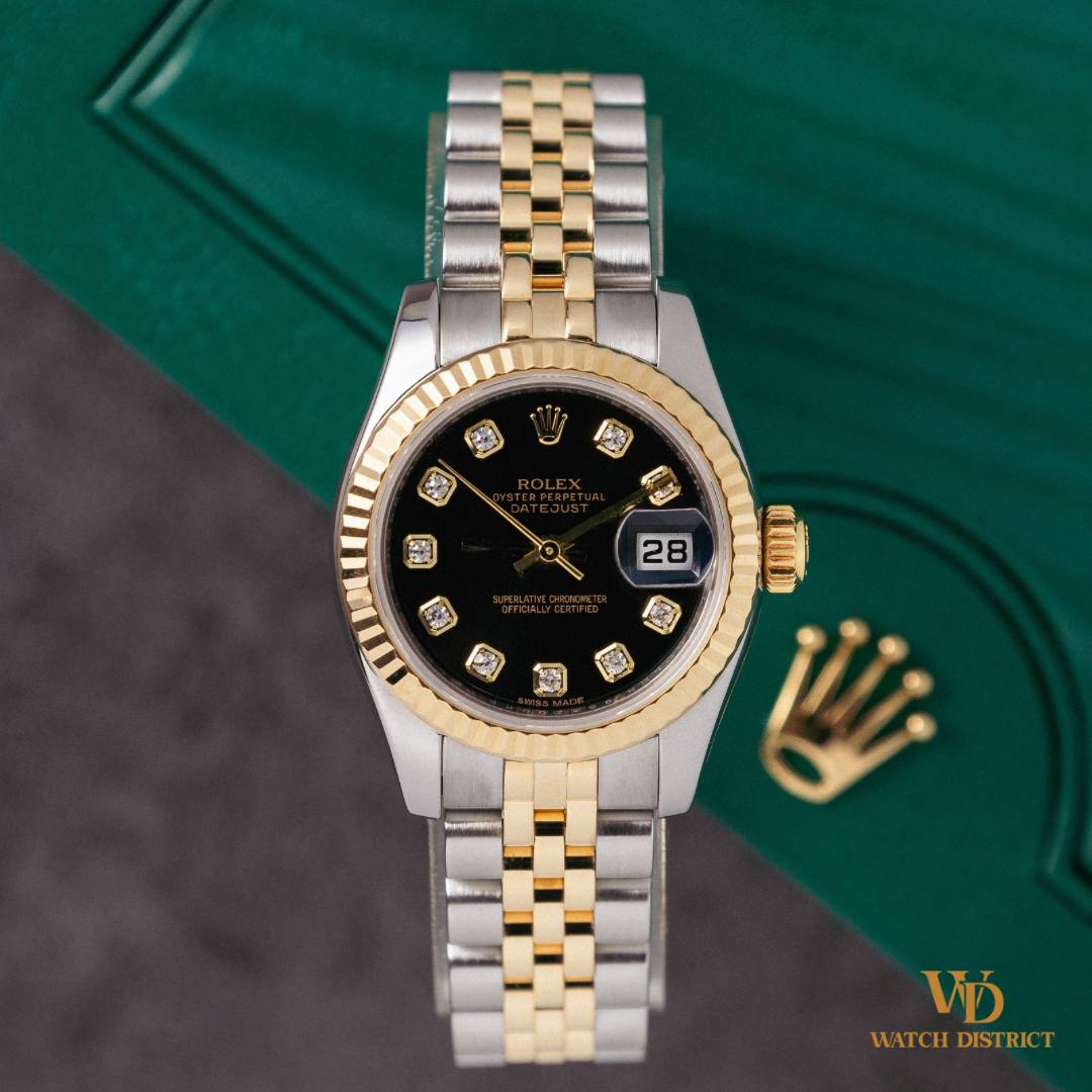 The 26mm Lady Two-Tone Datejust Rolex 179173 with a black 10-PT diamond dial is a perfect blend of elegance and sophistication. The striking contrast between the dark dial and the sparkling diamonds creates a refined look, while the 18k yellow gold case and Oystersteel bracelet provide durability and comfort. This timepiece offers both luxury and functionality, making it ideal for everyday wear or special occasions.