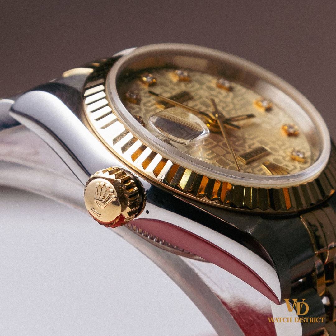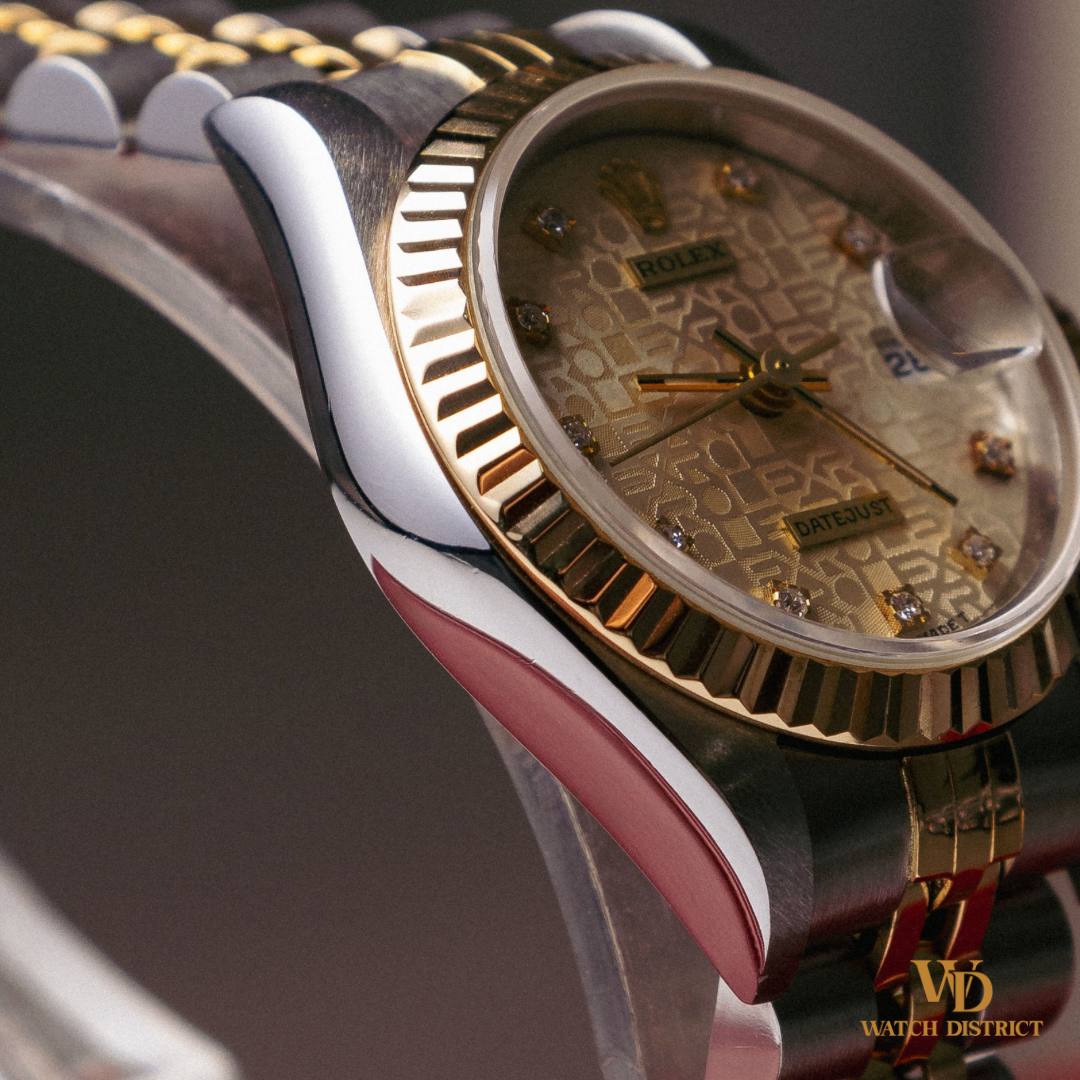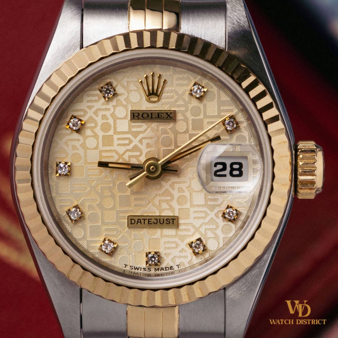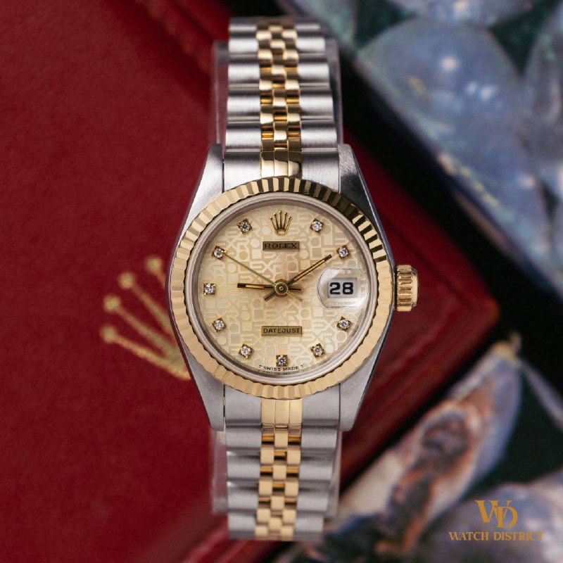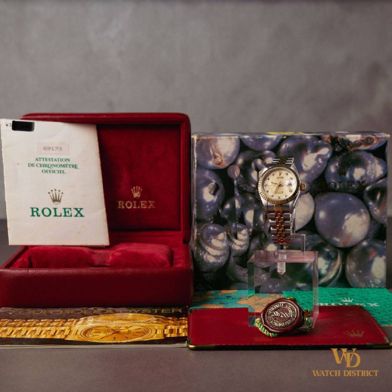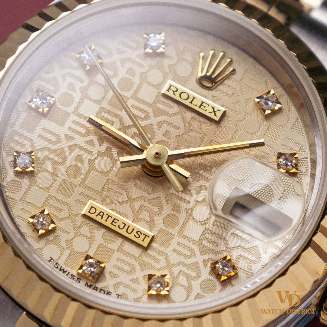 Introducing the stunning Ladies Rolex Datejust 69173, featuring a breathtaking anniversary jubilee dial that radiates a soft sheen. This model is adorned with exquisite 10-point diamond hour markers, meticulously set to enhance the dial’s luxurious appearance while preserving its classic charm. The discontinued 69173 is celebrated for its 26mm case size, crafted from 18k yellow gold and stainless steel, ensuring durability and elegance. Its fluted gold bezel perfectly complements the intricate dial design, making it an ideal choice for both everyday wear and special occasions. Complete with its original box & Singapore warranty certificate dated 23 Dec 1995, this set is perfect for discerning lady collectors who appreciate Rolex’s fine craftsmanship & heritage!