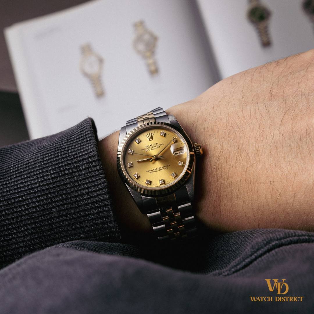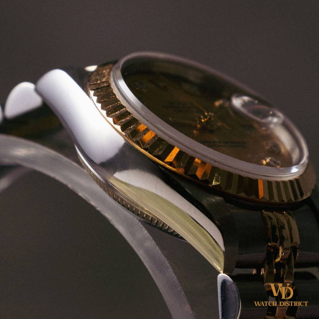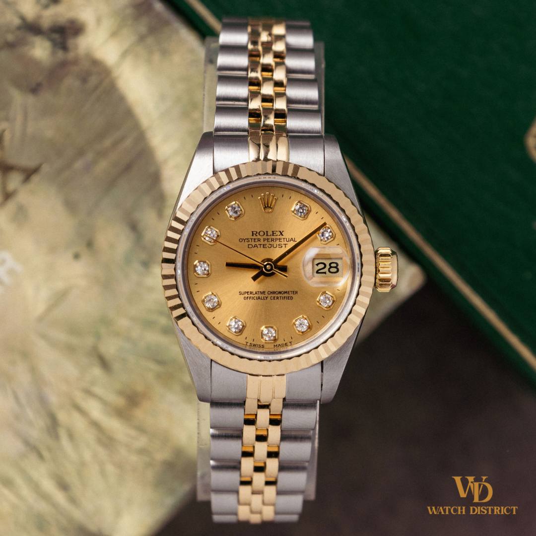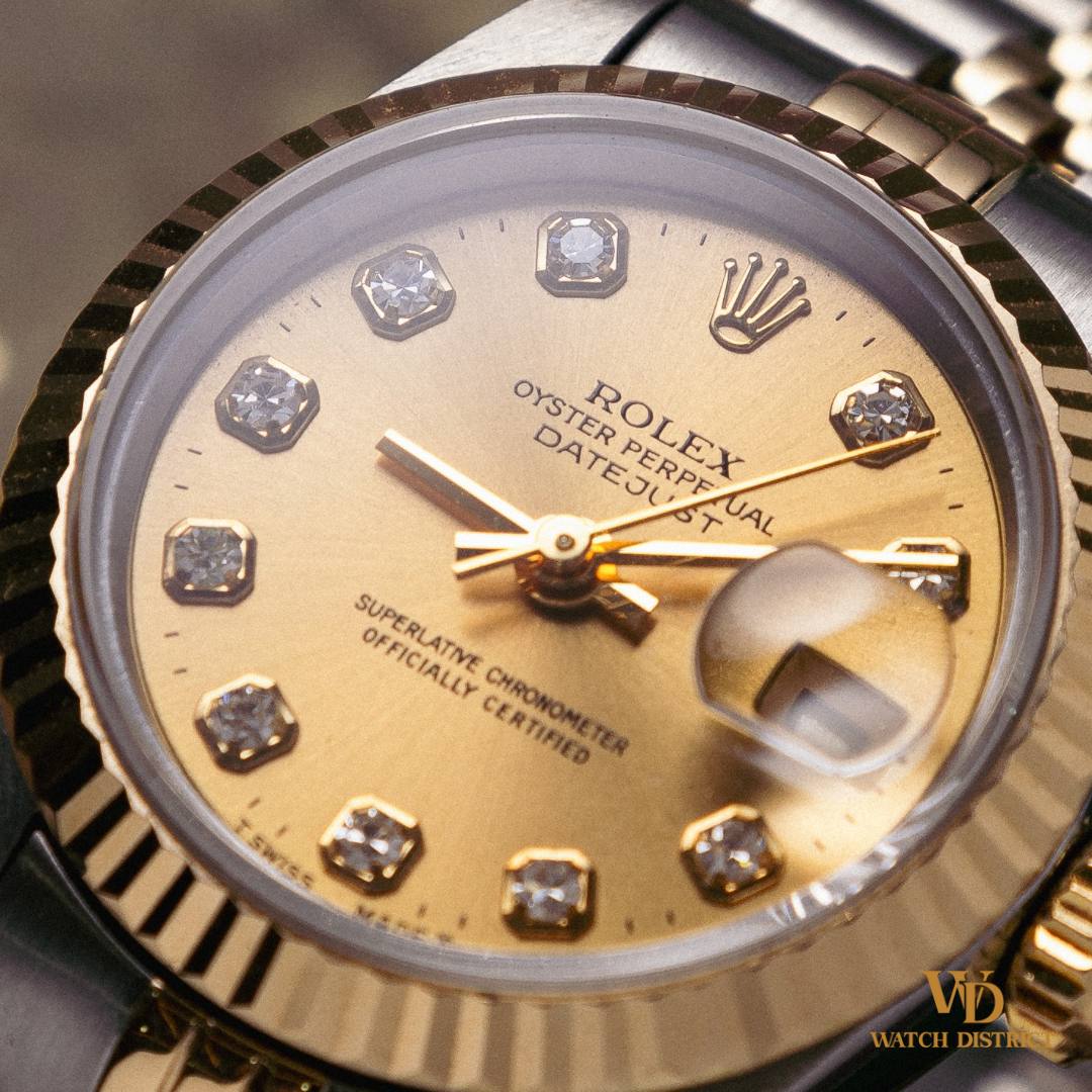 Introducing the stunning Ladies Rolex Datejust 69173, featuring a classic champagne dial that radiates a soft sheen. This model is adorned with exquisite 10-point diamond hour markers, meticulously set to enhance the dial’s luxurious appearance while preserving its classic charm.
