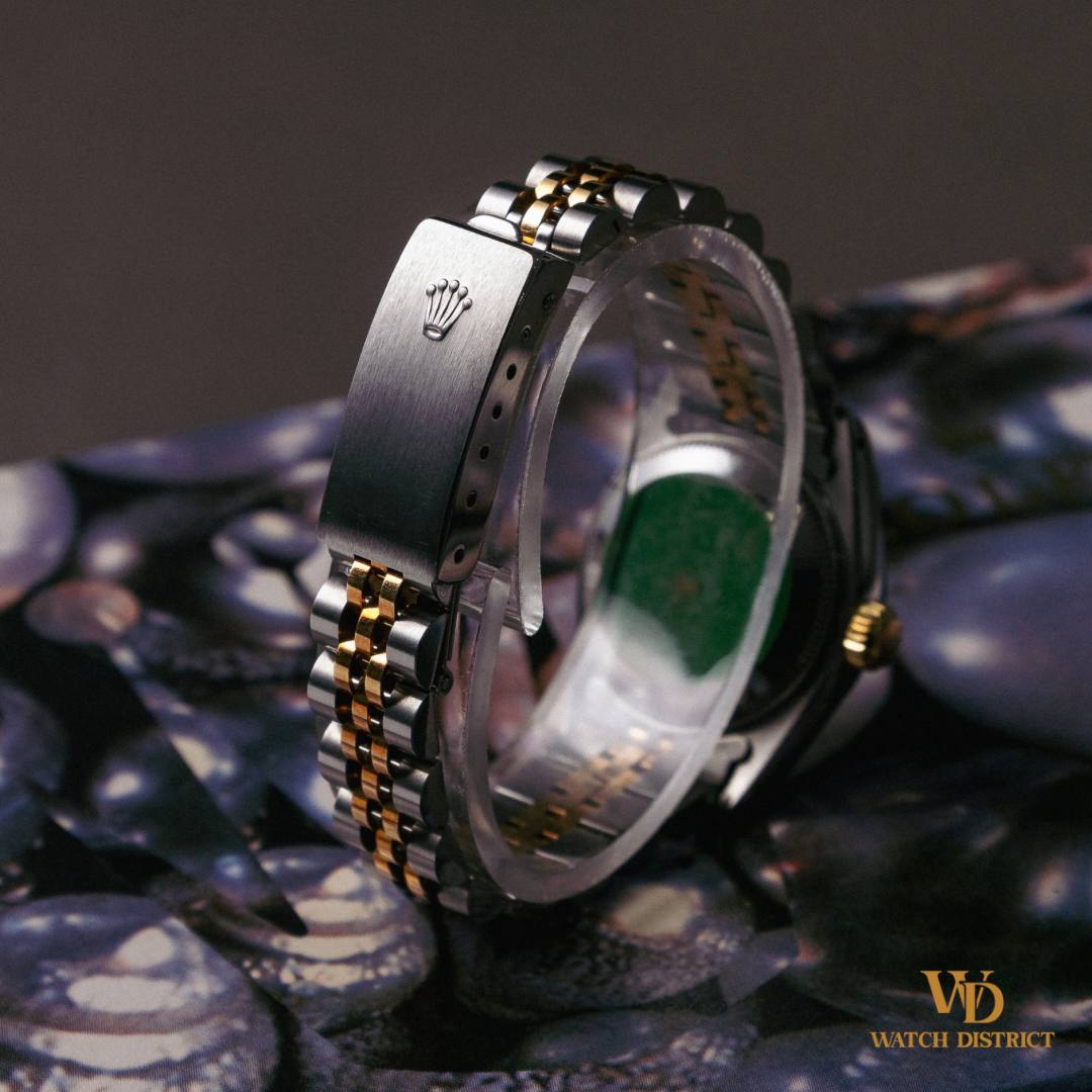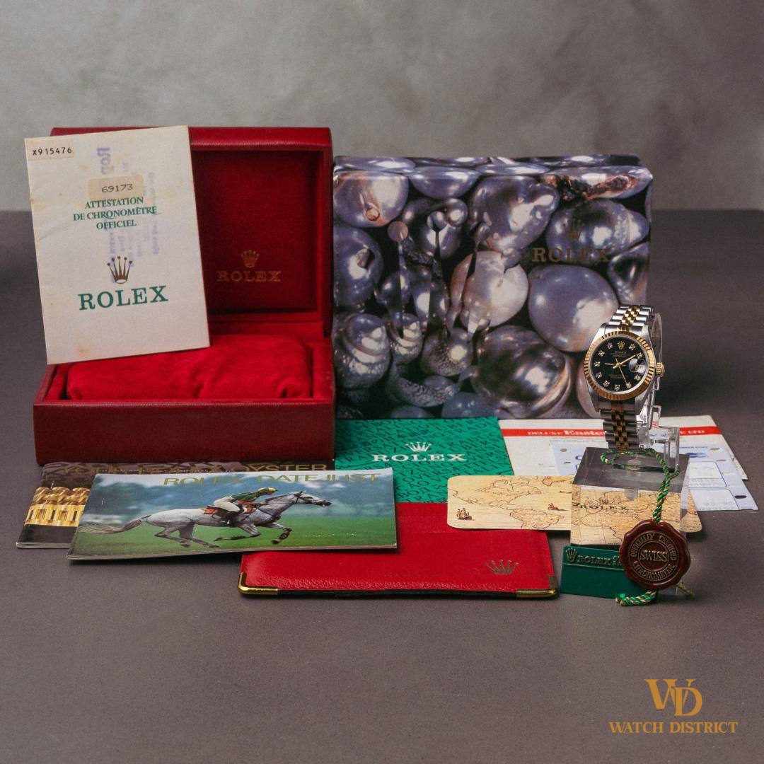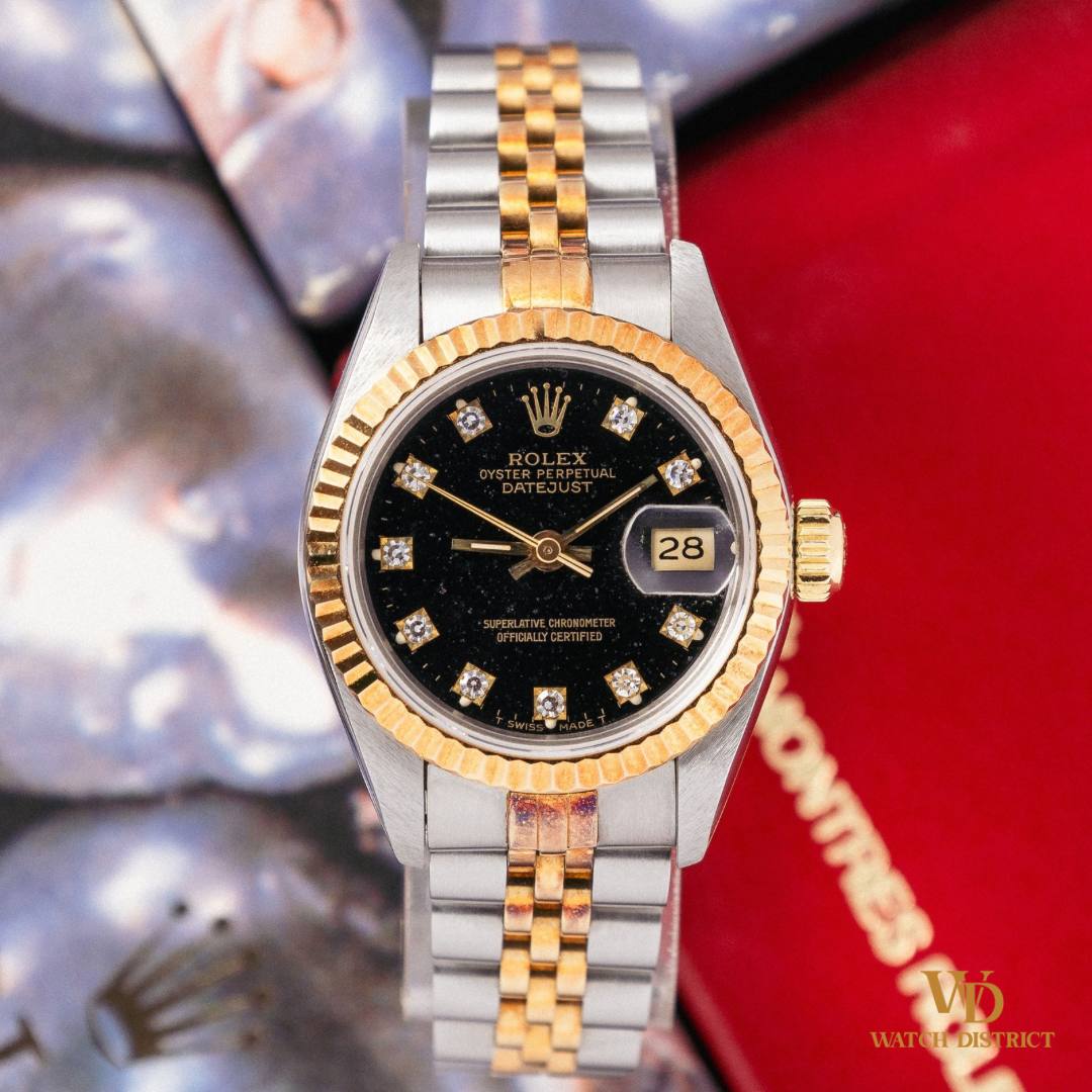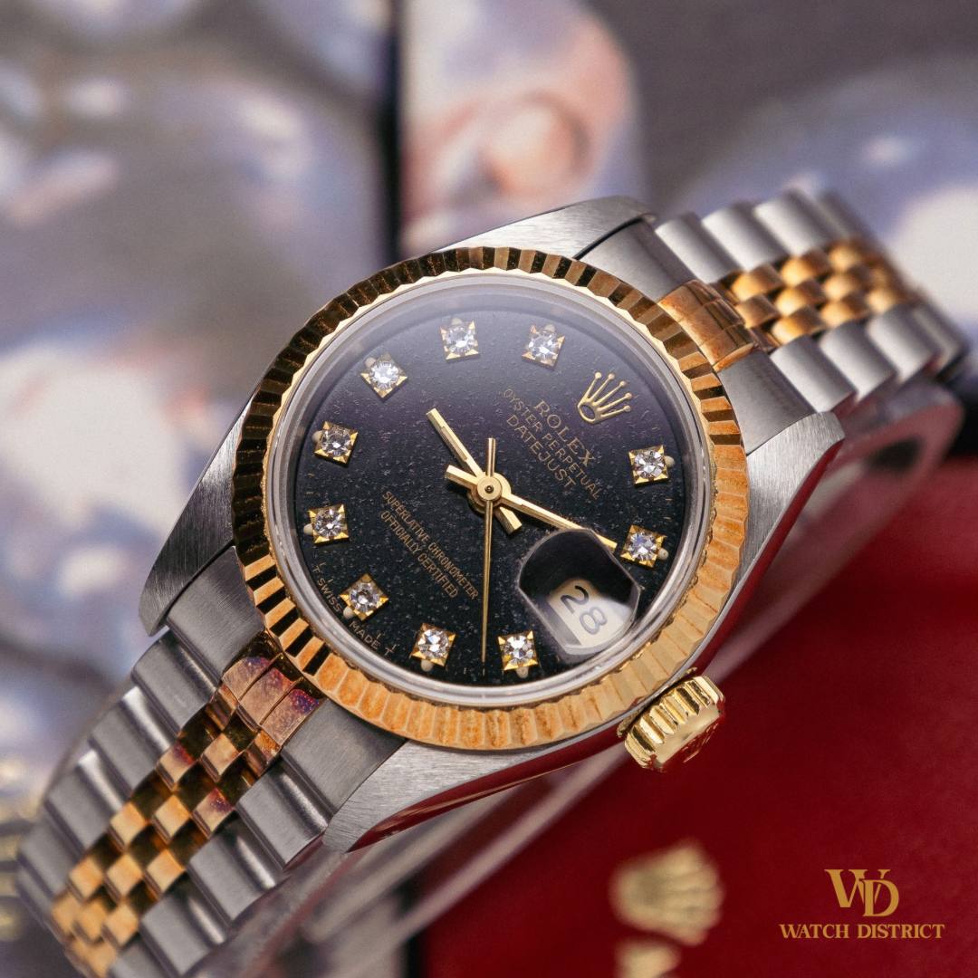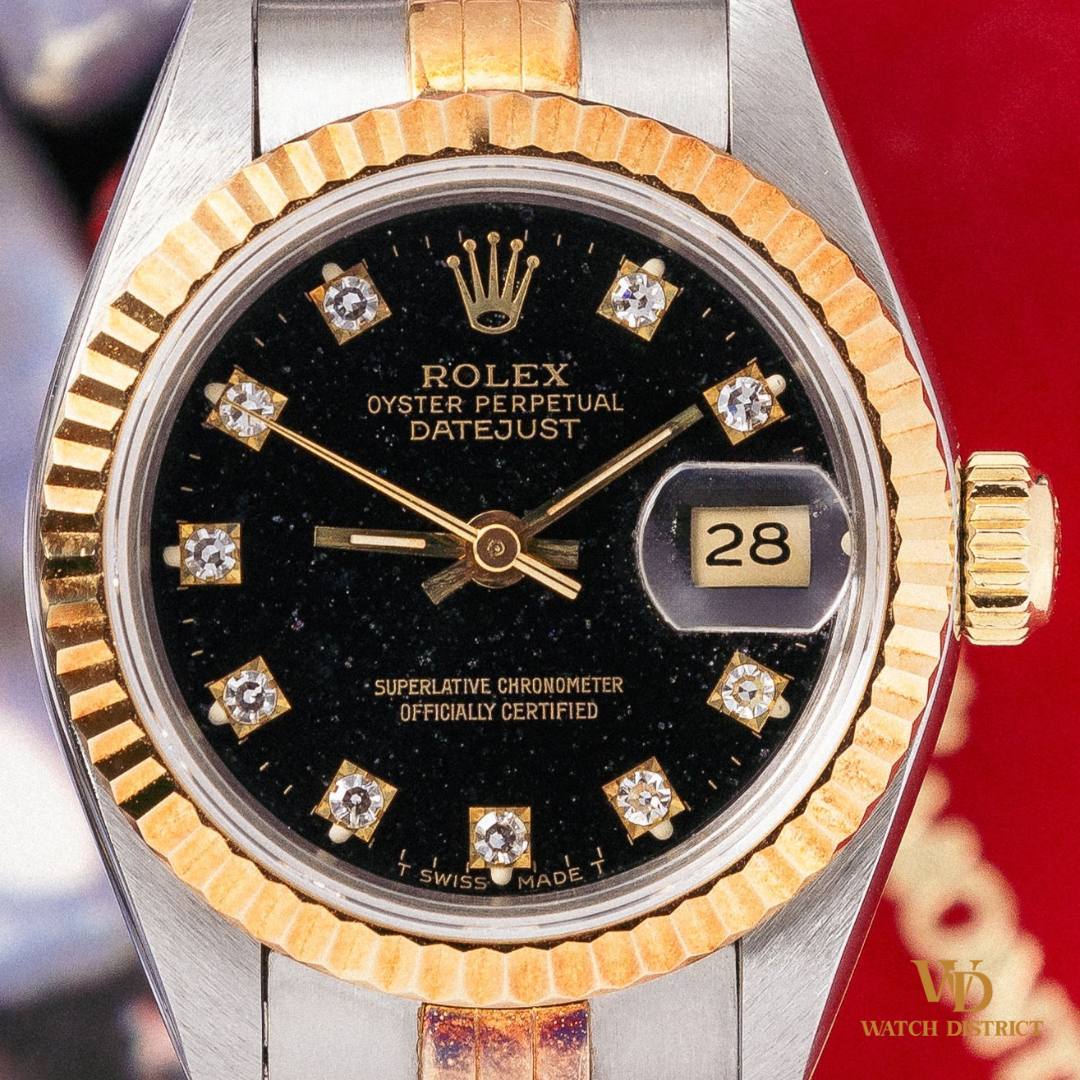 Enhance your collection with this exquisite Rolex Datejust 69173, boasting a one of a kind original 10-Pt diamond black dial that has developed a unique Stardust patina over time, resembling a Snowflake platter.