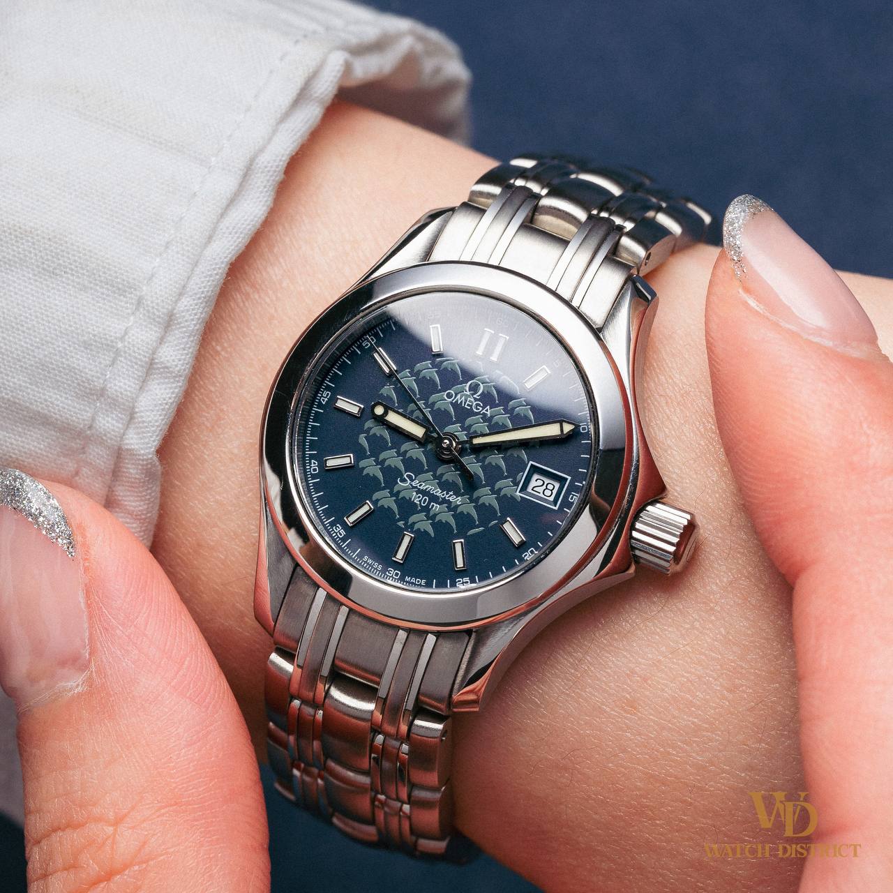 A poetic tribute to ocean freedom, this 2002 26mm Omega Seamaster Jacques Mayol 2588.80 celebrates the legendary freediver with a rare dolphin-motif dial. The deep navy backdrop shimmers like open water, while the playful dolphins at centre capture the spirit of breath, calm & exploration that defined Mayol’s legacy!
