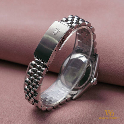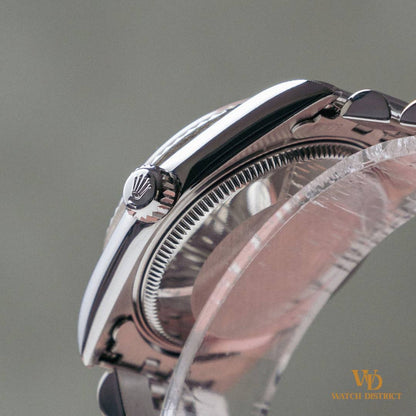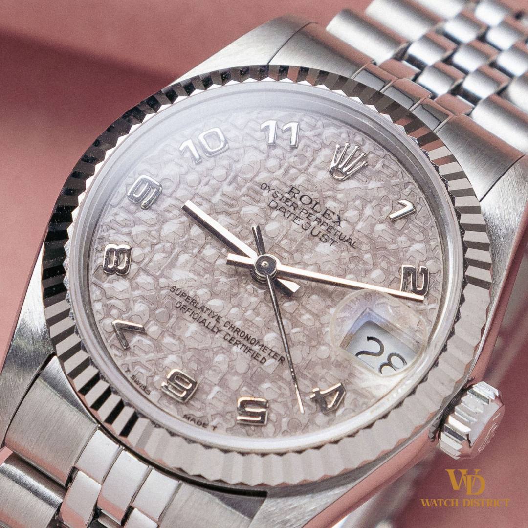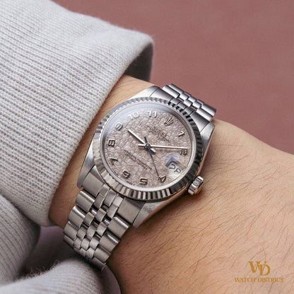 Paired with crisp Arabic numerals and jet-black hands, the contrast is striking, allowing the dial’s aged elegance to take center stage. The white gold fluted bezel frames it perfectly, while the Jubilee bracelet ties it all together in quintessential Datejust fashion.
