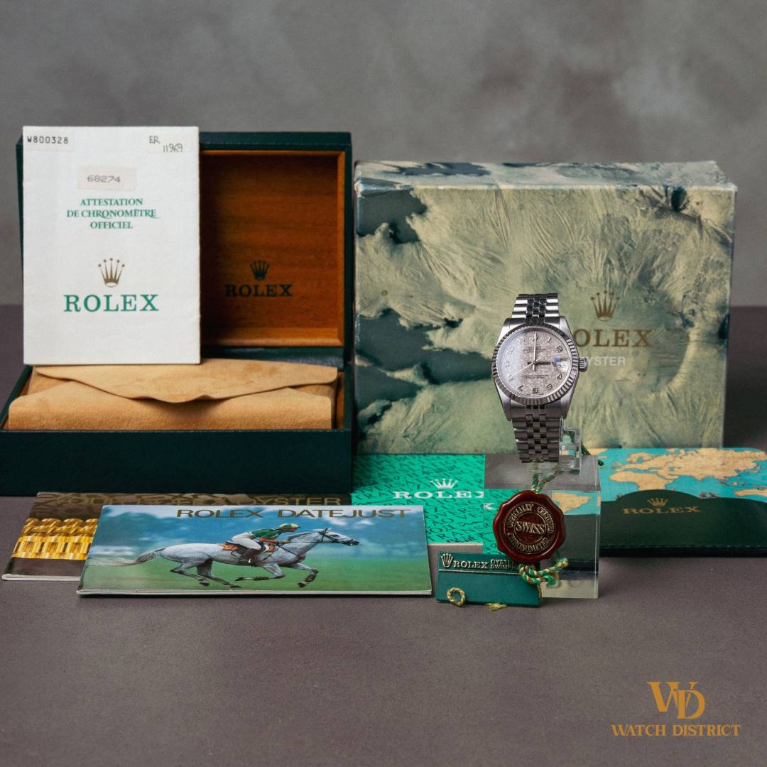 Here’s a truly special offering from the golden age of neo-vintage Rolex: the 31mm Datejust 68274, a timeless classic with a dial that’s anything but ordinary. What we have here is not just any dial — this is a rare Rolex Anniversary Jubilee dial, originally produced to celebrate the brand’s heritage. But what makes this example truly unique is the way it has aged over time, developing a soft, organic hue that resembles the texture and tone of natural fossil stone.
