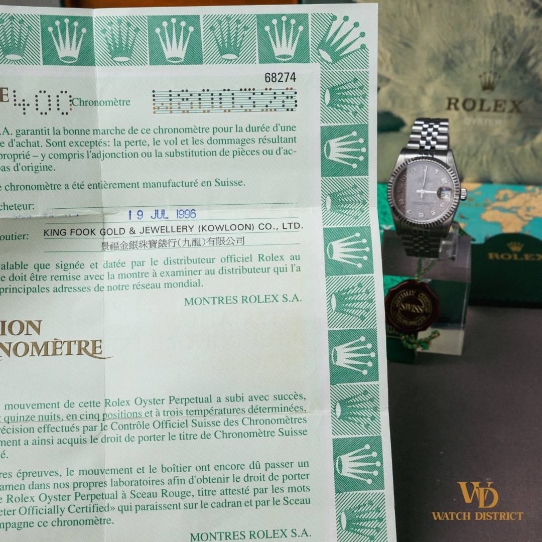 This piece is a full set dated 19 July 1996, sold by King Fook Jewellery in Kowloon, and includes its original inner and outer boxes, punched papers, green tag, red COSC seal, calendar card, and all booklets — a complete collector’s dream!