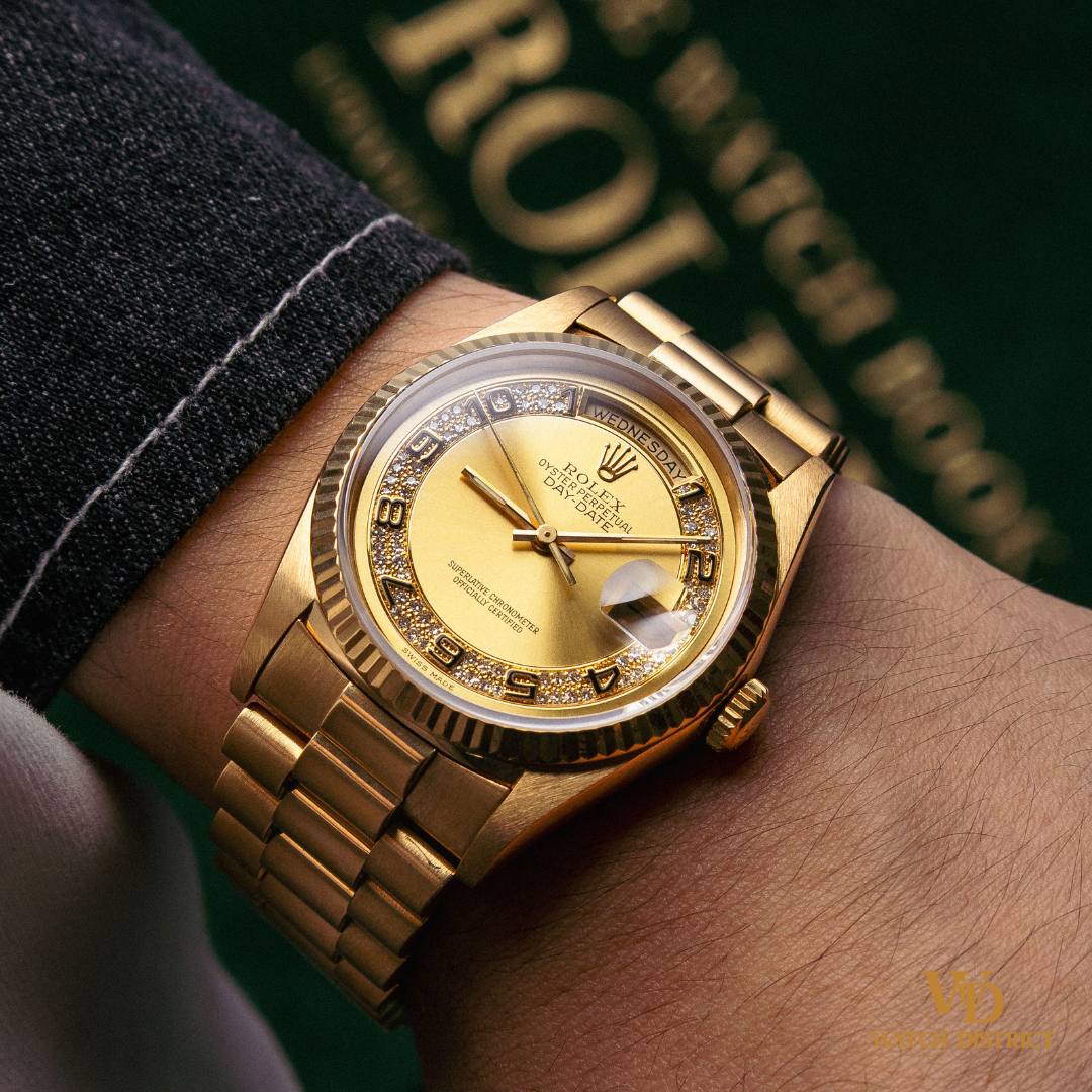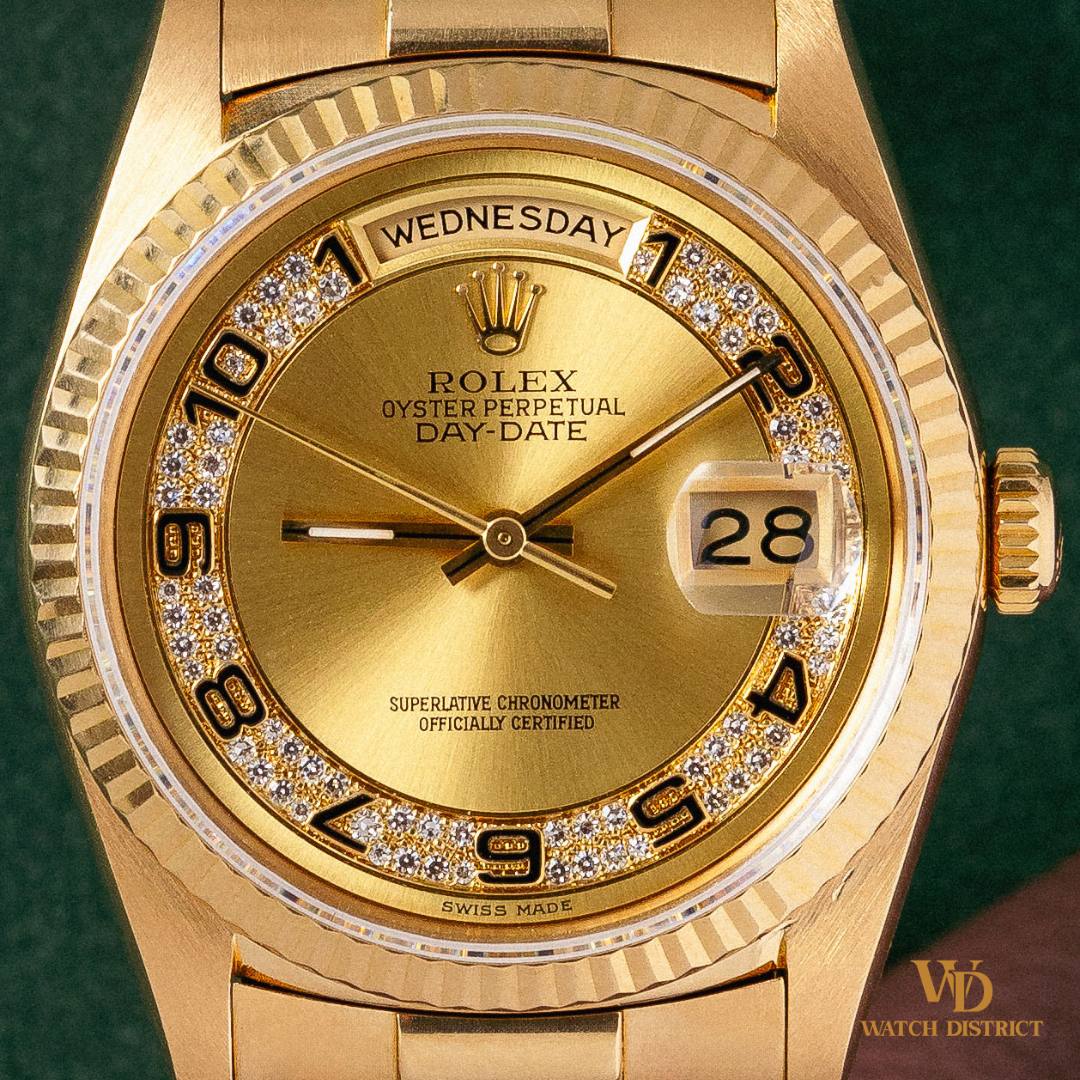 This Rolex Day-Date 18238 is distinguished by its rare and captivating myriad diamond dial, a true collector’s treasure. The dial features a delicate pattern of diamonds radiating across the surface, creating a textured effect that plays beautifully with light and adds depth to the classic Arabic numerals dial markers. This intricate detail sets the watch apart from standard models, making it highly sought after among enthusiasts who appreciate subtle yet unique dial variations.