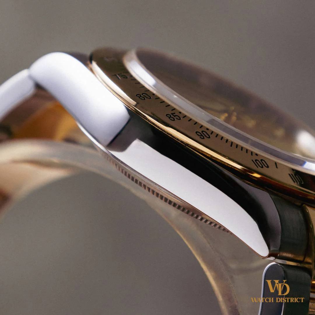 Introducing the Rolex Daytona 116523 with a stunning Champagne Mother of Pearl (MOP) Roman Numeral dial—an exceptional timepiece that combines elegance, rarity, and craftsmanship. This particular model is a true collector’s dream, featuring the luxurious and unique Champagne MOP dial, which creates a mesmerizing iridescent effect that changes with the light, giving each viewing a new experience.